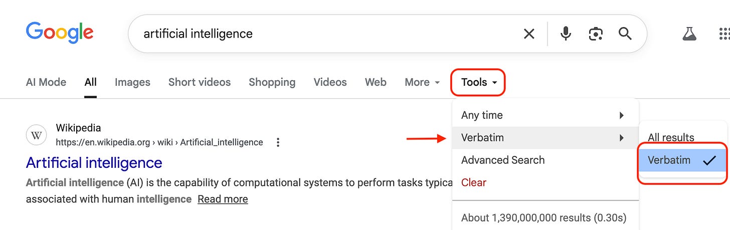 is the most powerful feature most people have never used. After any search, click Tools (just below the search bar), then the “All Results” dropdown, then select “Verbatim.”