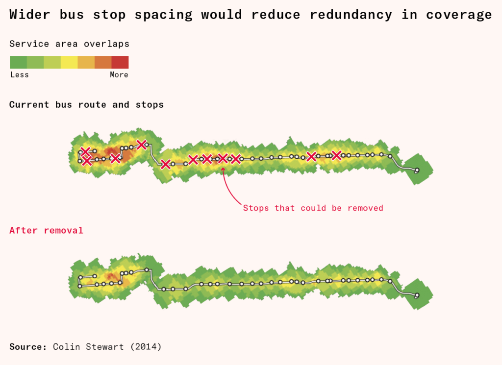 Frequent stopping is part of a strategy that maximizes coverage – giving everyone some access to the bus – even at the expense of overall ridership, which is largely a function of how useful the bus is relative to other transport options. In England, where 28 percent of all bus passengers are on concessionary fares for age or disability, Prime Minister Margaret Thatcher is supposed to have said, ‘If a man finds himself a passenger on a bus having attained the age of 26, he can count himself a failure in life’. This pattern, of only those without good alternative options riding the bus, is especially pronounced in the US. But close stop spacing creates problems.