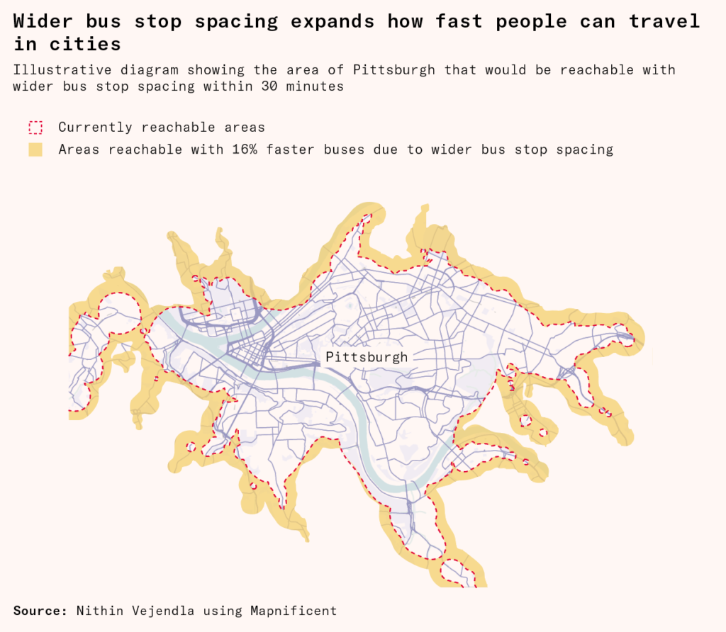 Access may be thought of in terms of the number of access points to the system, for example the number of bus stops or metro stations. But planners also think about access in terms of where the system can take you. This idea can be visualized as isochrones – shape maps that show the distance one can travel in a set time. By speeding buses up, stop balancing actually increases the number of destinations reachable within a given timeframe.