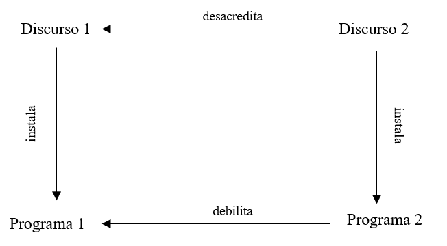 Na perspectiva do Programa dos Programas (Camus e Lescano, 2021; Coletivo Programa, 2022), consideramos que os programas de um espaço semântico possuem essas duas formas possíveis e também que eles são inseparáveis de tudo o que os vincula ao espaço ao qual pertencem, ou seja, suas relações e a força que possuem, isto é, o grau de facilidade com que se pode produzir discursos a partir deles.